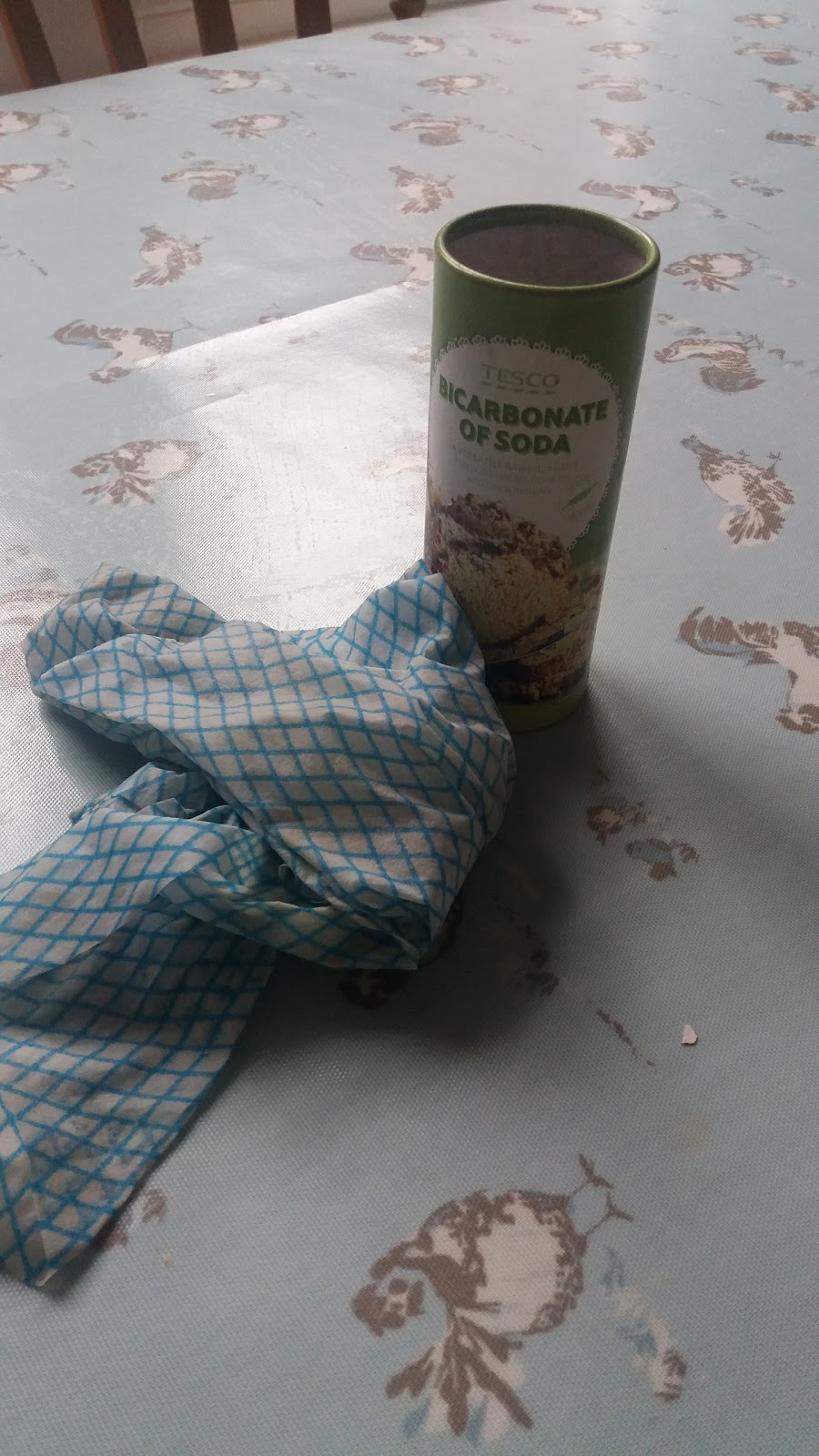 All cleaning products come in plastic bottles. All of them. Every single one. Apart from bicarbonate of soda. So that is what I cleaned my house with today. It's actually pretty effective. Two years ago, I painted some furniture in the dining room and managed to splash a lot of blue paint on the chairs. Until now, nothing has been able to remove the paint, but I am happy to report that the bicarbonate of soda was just the ticket.